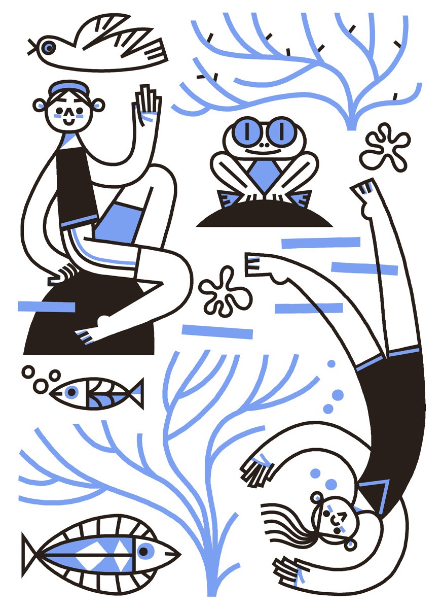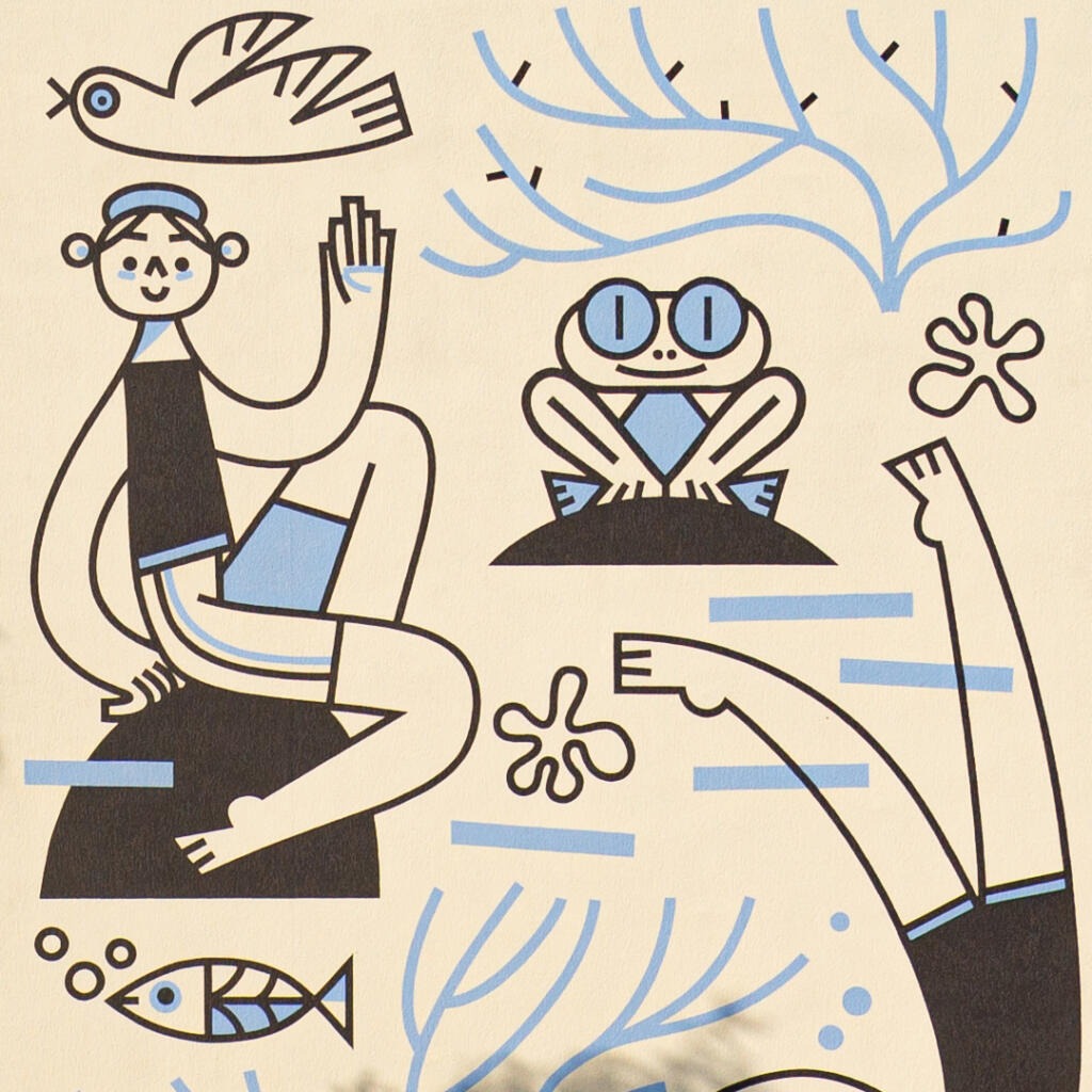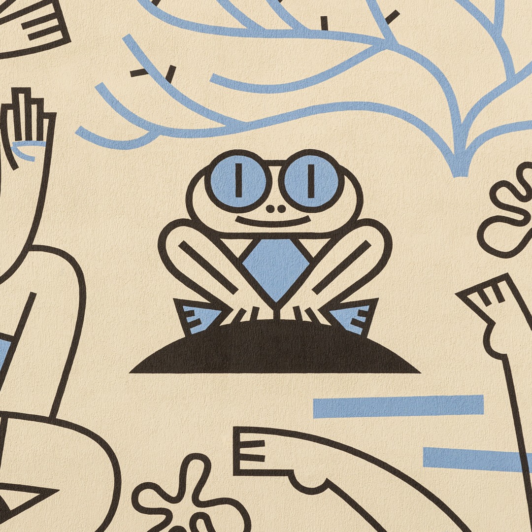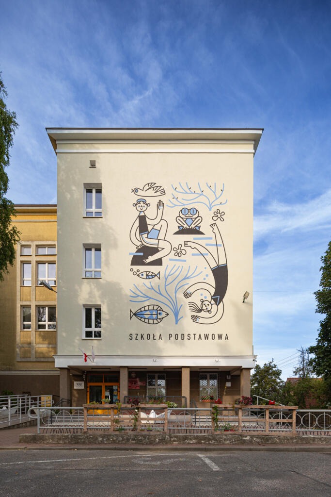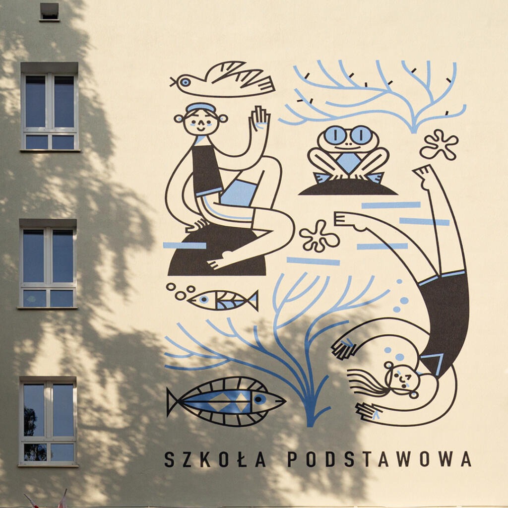 Traffic Design invited me to design a mural for one of the primary schools in Gdynia (a city in Poland located on the Baltic Sea). Hearing, deaf, and hard-of-hearing children study at the school. I decided to draw children playing by the water. One of them is basking in the sun; the other one dives. It’s a symbolic bridge between silence (water) and sound (air). The giant frog was inspired by students’ drawings.