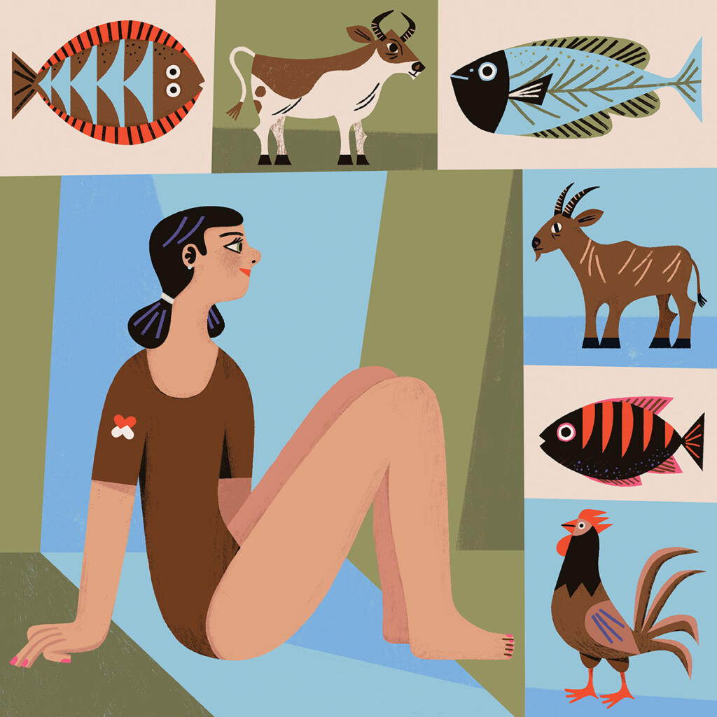 My illustration shows a human standing on equal footing with the animals, returning their gaze, aware that their own existence is inextricably intertwined with theirs.